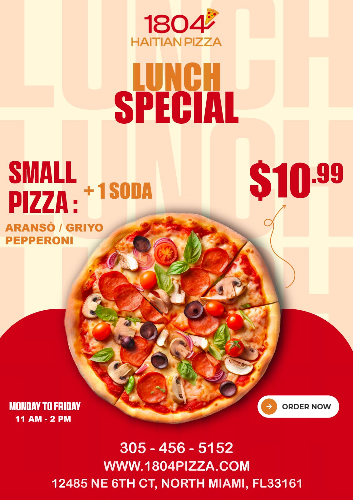Discover 1804 Pizza, North Miami’s top spot for Haitian food and hand-tossed pizza bursting with authentic island flavor. We’re famous for our Giryo pizza, a Haitian classic reimagined with fresh ingredients and bold Caribbean spices. Our menu highlights the best in Haitian cuisine, from savory traditional dishes to unique Haitian-style pizza made daily. Stop by for our daily specials, or order takeout and delivery anywhere in North Miami, Miami Gardens, Little Haiti, or Biscayne Park. Planning a celebration? We offer catering and party packages perfect for any event. For delicious Haitian pizza in North Miami, taste the flavor of Haiti today!